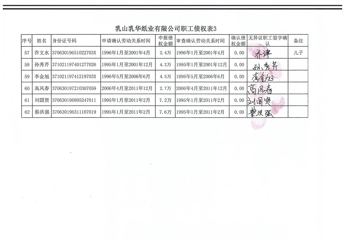 破产受理后,孙玉嵩等62名职工向管理人提交了申报材料,要求管理人确认劳动关系时间并补缴劳动关系存续期间的社保费。管理人就职工申报材料核实了财务账簿及相关人员,对该62名职工债权进行了审核。经审查确认了职工的劳动关系时间,但对于其主张补缴劳动关系存续期间的社保费,因超过劳动仲裁时效,不予确认,认定债权总金额为0元,现将审查结果进行公示。